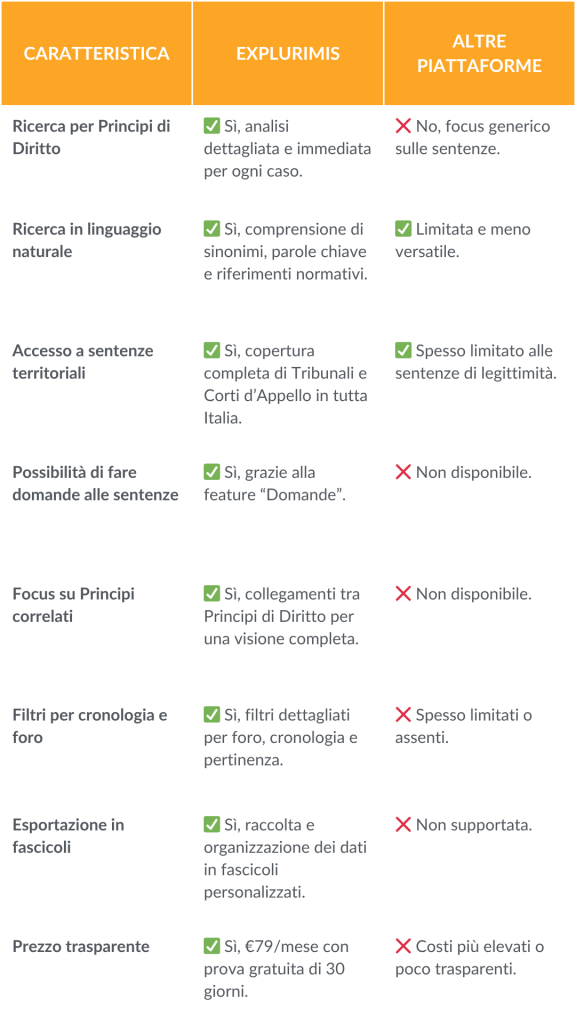 Con Explurimis puoi descrivere subito il tuo caso e ottenere automaticamente un parere profondo e strutturato, accedendo al tempo stesso a Principi di Diritto e sentenze pertinenti, chiare e organizzate – tutto in pochi click.